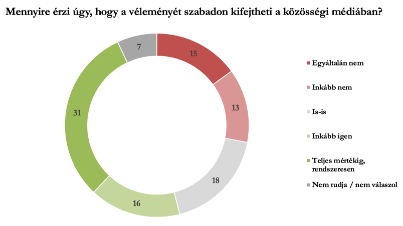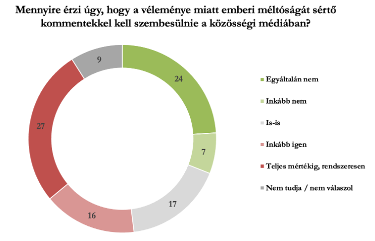 A válaszadók közel fele (47 százalék) úgy érzi, hogy teljesen, vagy többé-kevésbé szabadon kifejtheti a véleményét a közösségi médiában, és csak a válaszadók 15 százaléka érzi úgy, hogy egyáltalán nem. Ugyanakkor a szabadságnak “ára” is van: a válaszadók 43 százaléka nyilatkozott arról, hogy véleménye miatt rendszeresen vagy többé-kevésbé szembesülnie kell emberi méltóságát sértő kommentekkel. A válaszadók közel negyedének (24 százalék) viszont egyáltalán nincs ilyen tapasztalata.