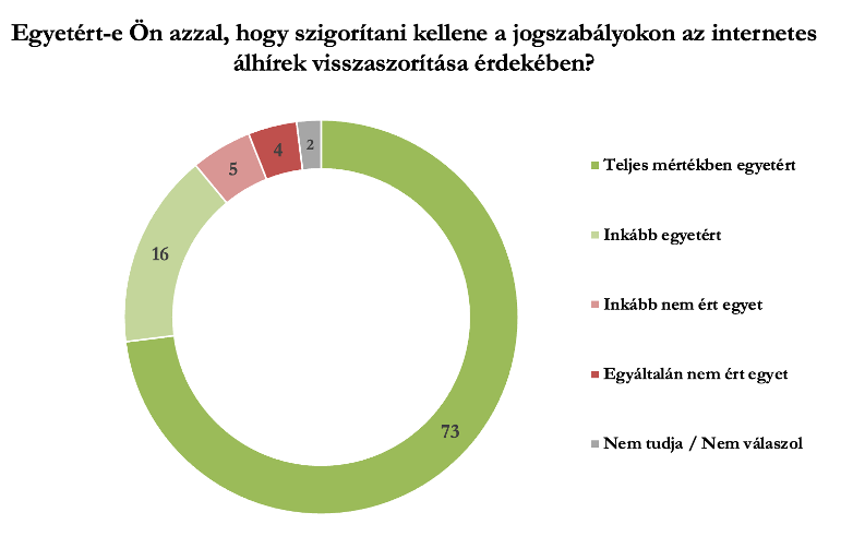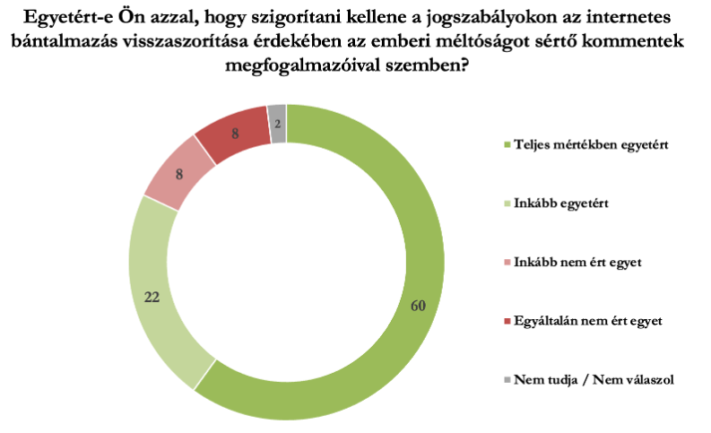 Arra a kérdésre, hogy “Egyetért-e Ön azzal, hogy szigorítani kellene a jogszabályokon az internetes bántalmazás visszaszorítása érdekében, illetve az emberi méltóságot sértő kommentek megfogalmazóival szemben?” Tíz válaszadóból nyolc (81 százalék) egy irányba tartó választ ad: teljes mértékig vagy inkább egyetért abban, hogy szigorítani kell. Így gondolja ezt a Fidesz-szavazók 91 százaléka, de a Tisza-szavazók 75 százaléka is.