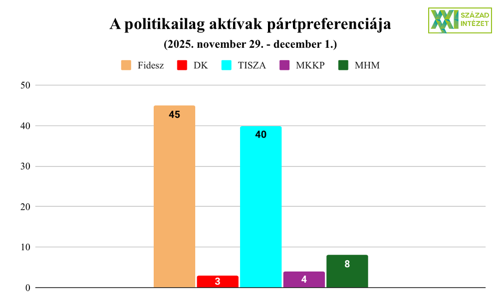 Jelen kutatás a XXI. Század Intézet “A társadalmi nyilvánosság szerkezetváltozása” elnevezésű kutatási projektje keretében készült, 2025. november 29. és december 1. között, 1000 fő telefonos megkérdezésével. A minta reprezentálja a felnőtt magyar társadalmat nem, életkor, lakóhely és iskolai végzettség alapján. A véletlenszerűség, valamint az egyes csoportokban az interjúszámok maximalizálása miatt, a különbségeket súlyozással pontosítjuk. A súlyozott adatbázisból a politikailag aktívak bázisán vizsgáljuk a pártpreferencia adatait. Politikailag aktívaknak azokat nevezzük, akik arról nyilatkoztak, hogy biztosan részt vennének egy most vasárnap esedékes választáson. A biztos pártválasztókat egy halmazba soroljuk azokkal, akiknek politikai szimpátiája a politikai issuek-ra vonatkozó további kérdések alapján valószínűsíthető. Így áll elő az egyes pártokat támogató szavazó (pl. “Fidesz-szavazó”). A kutatás tehát az összes aktív, részvételében biztos választópolgár preferenciáját tartalmazza, direkt közlés vagy segédkérdések segítségével történő beazonosítás alapján a pártok valószínűsíthető országos listás eredményeire vonatkozóan.